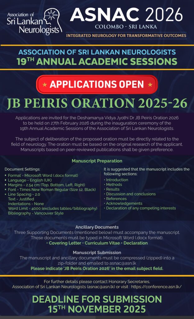 Applications are invited for the Deshamanya Vidya Jyothi Dr JB Peiris Oration 2026 to be held on 27th February 2026 during the inauguration ceremony of the 19th Annual Academic Sessions of the Association of Sri Lankan Neurologists.